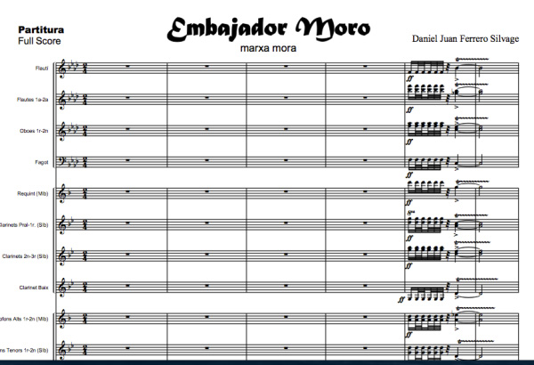 Maurischer Marsch, im Auftrag der Stadt Elda als Pflichtstück im XII. Blaskapellenwettbewerb 1997, Werk des Komponisten Daniel Ferrero Silvaje. Daniel Ferrero hat einen Abschluss in Horn, Harmonielehre, Komposition und Instrumentierung, Chorleitung und Orchesterleitung und dirigierte mehrere Gruppen, darunter das Orchester des Konservatoriums von Valencia, das Vallés Symphony Orchestra, die Unió Musical de Muro und die Municipal Band von Villena. Von 1987 bis 2000 war er Chefdirigent der Ontinyent Musical Artistic Union Band, mit der er mehrere Auszeichnungen gewann. Von 2001 bis 2005 war er Chefdirigent der Band der Alteanense Philharmonic Society. Mit dieser Band eröffnete er den Palau Altea und gewann mehrere Preise in Murcia und beim Kerkrade-Wettbewerb im Jahr 2005.