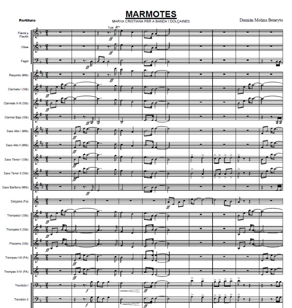 Marcha Cristiana para Banda y Dulzainas de Damián Molina Beneyto. Como compositor ha obtenido diversos premios en concursos de composición: hay que destacar tres primeros premios, uno en Benidorm, año 1999, y otro en Muro de Alcoi, año 2009, con la obra para banda sinfónica “Dodecaedro Sonoro”, y otro recientemente (2011), convocado por la “CESM” (confederación española de sociedades musicales), con la obra sinfónica “ONIROS”.